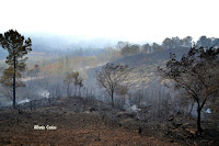 La primera es una foto del Monte de los Pozos al día siguiente y la otra un coche calcinado en Freixo.